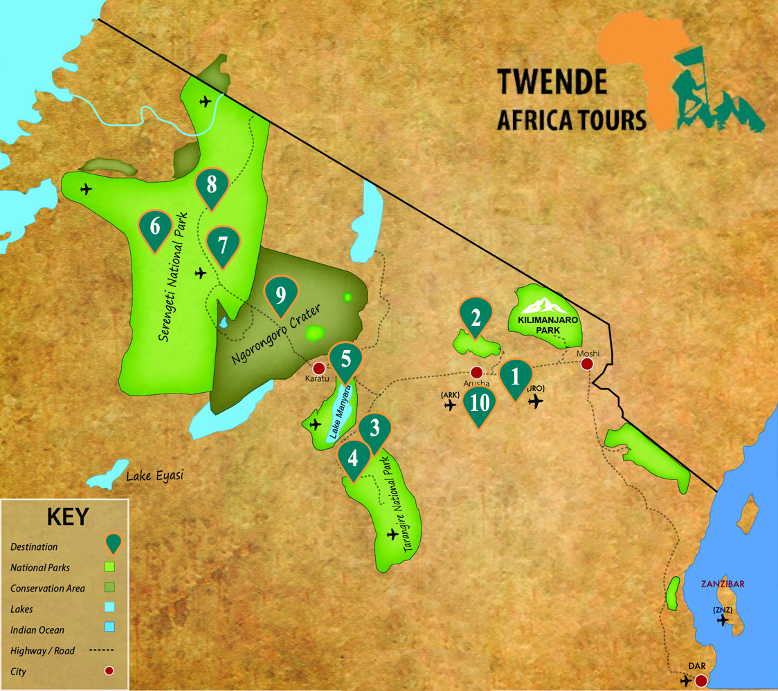 The tour starts and ends in Moshi/Arusha Tanzania. The tour will take you to Tarangire, Serengeti and Ngorongoro Conservation Area. The tour will also take you to Serengeti national Park with a massive wilderness of over 14,500 sqkm where every day brings new adventure as well as a new landscape. The same safari will take you to Ngorongoro crater as well as the Ngorongoro conservation Area in Tanzania, this one features one of the highest concentrations of game as well as a large population of carnivores and predators in Africa. In these parks, you will witness the amazing diversity and abundance of African wildlife species. The tour will end at the Tarangire national park which has the greatest concentration of the game in Tanzania. You will view many wildlife species within all these parks.