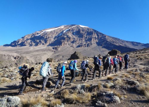 Our day starts by descending into the start of the Great Barranco, a huge ravine. We then exit steeply, up the Great Barranco Wall, which divides us from the southeastern slopes of Kibo. It’s a climb over rock, not technical but long and tiring. Passing underneath the Heim and Kersten glaciers, we head towards the Karanga valley. From here we have a steep climb up from Karanga valley to our night’s camp at Karanga camp, set at 3963m. For those feeling strong we will go for a mid-afternoon acclimatization trek up to around 4200m before descending back to camp for the night.
